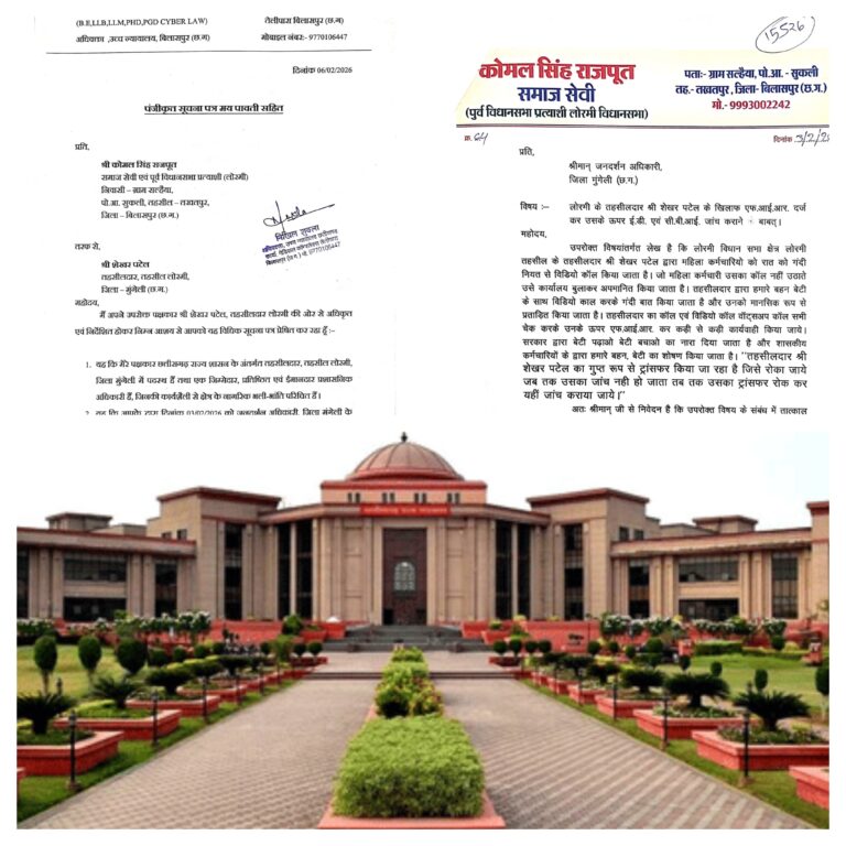 हाईकोर्ट में मानहानि नोटिस, भ्रामक प्रचार करने वालों पर कानूनी कार्रवाईलोरमी। राजनीति के केंद्र बिंदु और चर्चित विधानसभा क्षेत्र लोरमी में एक ईमानदार छवि के प्रशासनिक अधिकारी को बदनाम करने की साजिश अब उलटी पड़ती दिखाई दे रही है। कुछ दिनों पूर्व तथाकथित समाजसेवक कोमल सिंह राजपूत, निवासी सल्हैया द्वारा तहसीलदार शेखर पटेल के खिलाफ…