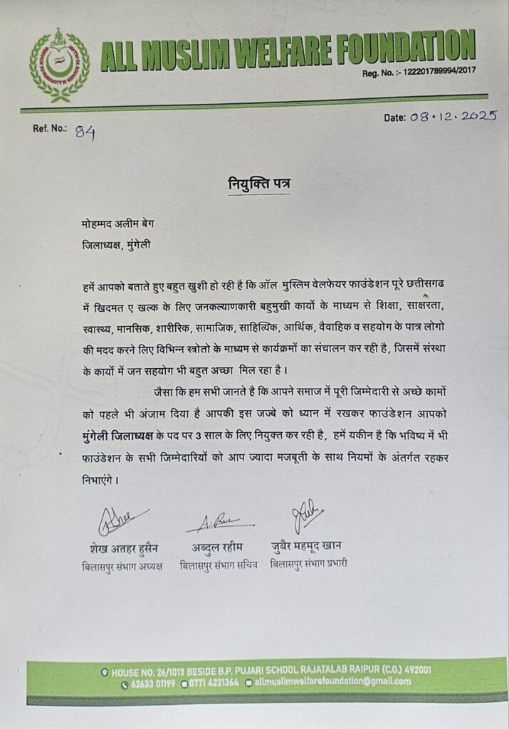 ऑल मुस्लिम वेलफेयर फाउंडेशन ने मोहम्मद अलीम को मुंगेली का जिलाध्यक्ष नियुक्त किया, कहा— “संगठन और समाज सेवा मेरी प्राथमिकता”