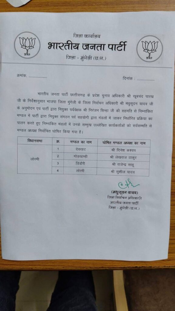 यह घोषणा भारतीय जनता पार्टी के जिला कार्यालय, मुंगेली (छत्तीसगढ़) से जारी की गई।