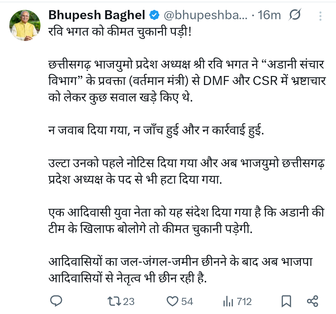 बघेल ने लिखा कि रवि भगत ने वर्तमान मंत्री से DMF और CSR में भ्रष्टाचार को लेकर सवाल पूछे थे, लेकिन न तो जवाब मिला, न जांच हुई और न ही कोई कार्रवाई। इसके बजाय उन्हें पहले नोटिस दिया गया और अब अध्यक्ष पद से हटा दिया गया।