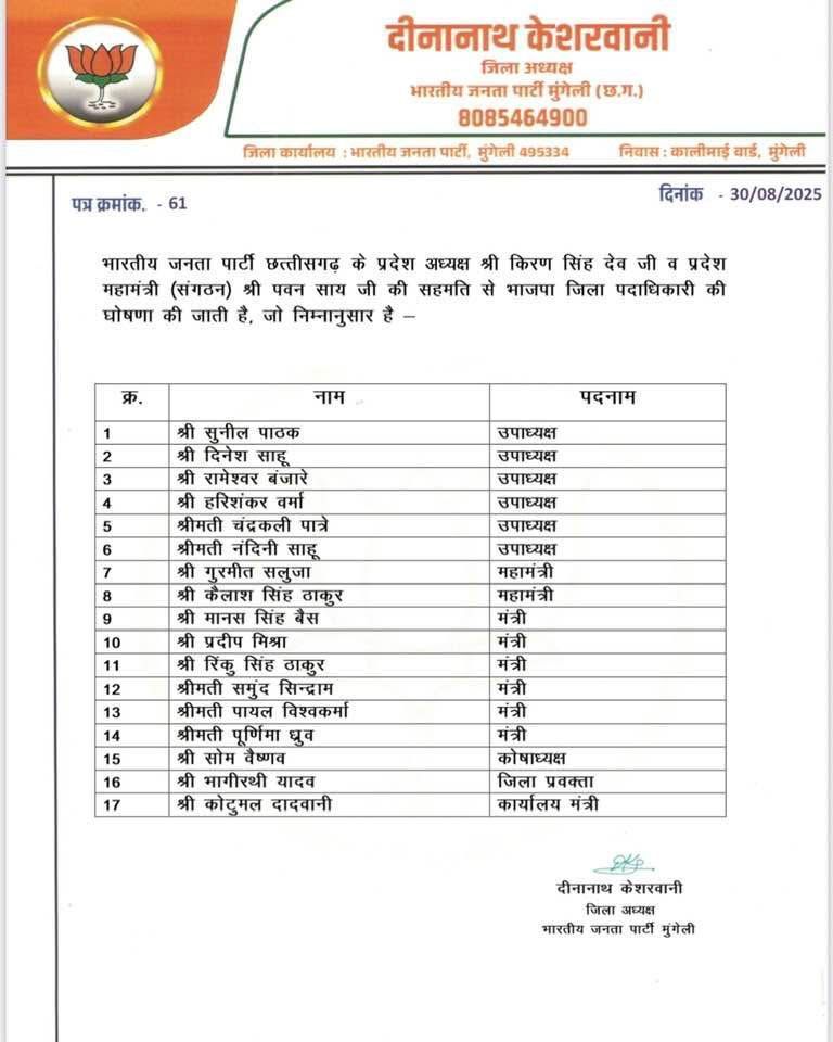 भाजपा मुंगेली जिला पदाधिकारियों की नई टीम घोषित, 17 नेताओं को मिली जिम्मेदारी