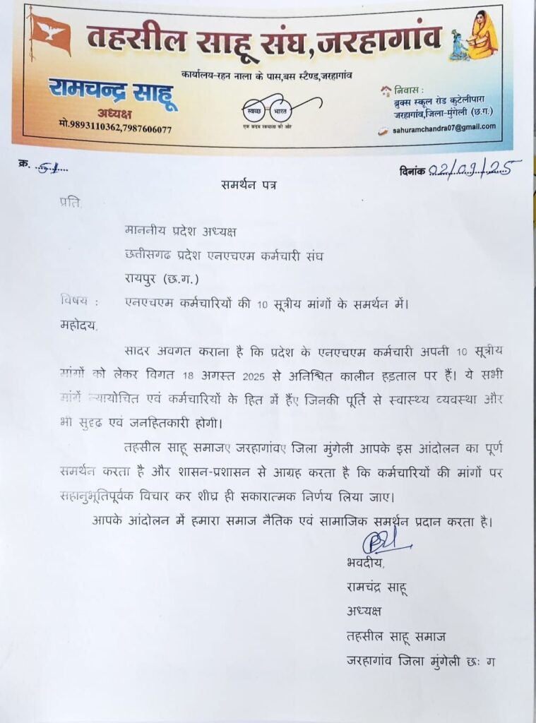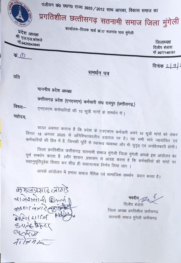 मुंगेली – जिले में एनएचएम संविदा कर्मचारियों की 10 सूत्रीय मांगों को लेकर चल रही अनिश्चितकालीन हड़ताल को अब राजनीतिक दलों, सामाजिक संगठनों और जनप्रतिनिधियों का बड़ा समर्थन मिल रहा है। आज तहसील साहू संघ जरहागांव, प्रगतिशील छत्तीसगढ़ सतनामी समाज जिला मुंगेली एवं केन्द्रीय गोंड़ महासभा मुंगेली ने हड़ताली कर्मचारियों के समर्थन में पत्र सौंपकर उनका मनोबल बढ़ाया।