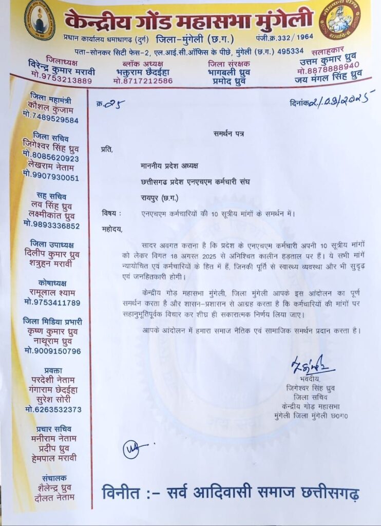 ➡️ केन्द्रीय गोंड़ महासभा मुंगेली के जिला सचिव जिगेश्वर सिंह ध्रुव ने कहा कि “पूरा आदिवासी समाज कर्मचारियों के साथ है और मांग पूरी होने तक संघर्षरत रहेगा।”