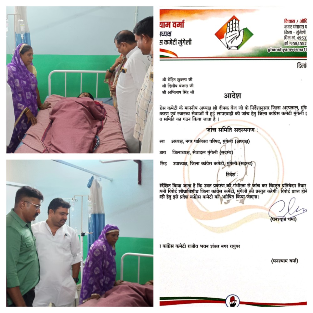 मुंगेली। जिला अस्पताल में गर्भवती महिला को इलाज न मिलने का मामला अब तूल पकड़ता जा रहा है। प्रदेश कांग्रेस कमेटी के अध्यक्ष दीपक बैज ने इस मामले को गंभीरता से लेते हुए जिलाध्यक्ष घनश्याम वर्मा को जांच के निर्देश दिए। निर्देश के पालन में जिलाध्यक्ष ने पीड़िता से मुलाकात कर पूरे घटनाक्रम की जानकारी ली और तीन सदस्यीय जांच समिति का गठन किया।
