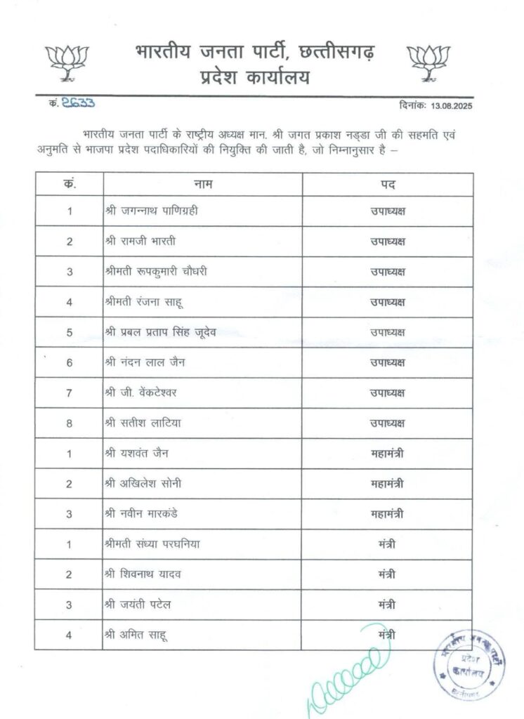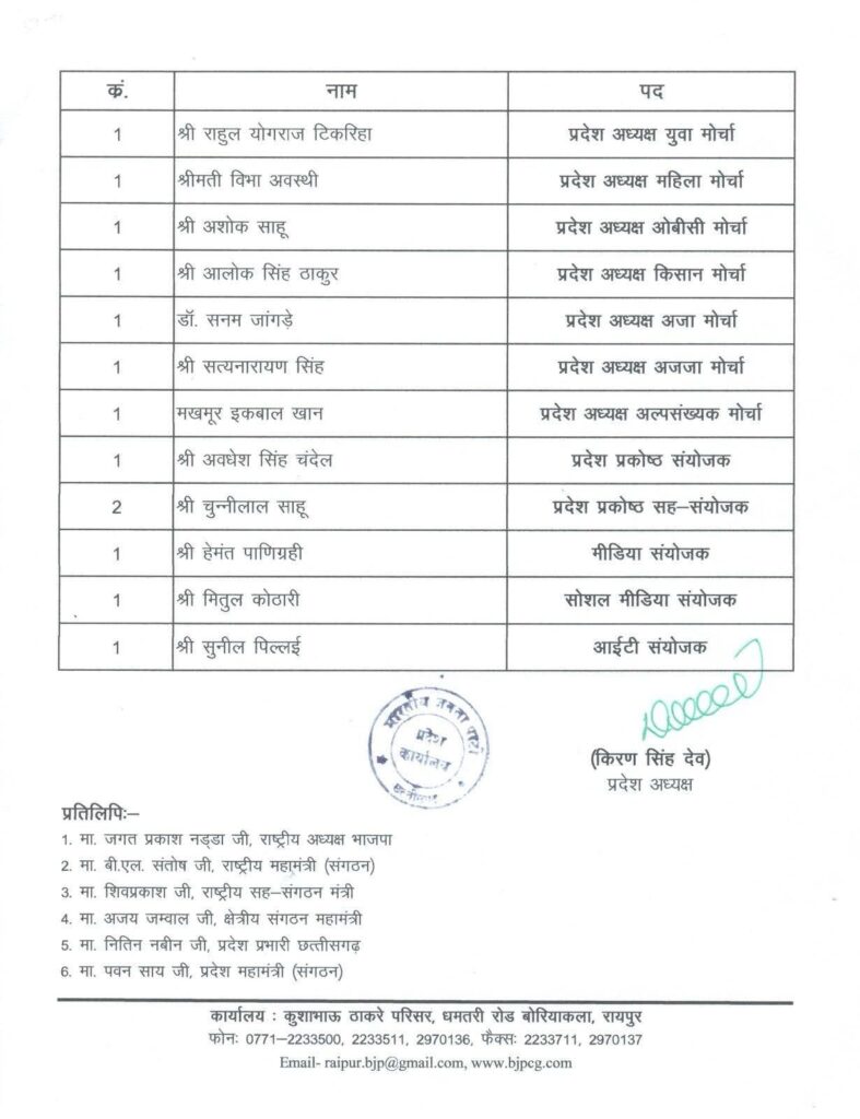 रायपुर। छत्तीसगढ़ भाजपा की बहुप्रतीक्षित कार्यकारिणी बुधवार को जारी कर दी गई। प्रदेश अध्यक्ष किरण सिंह देव ने नई टीम की घोषणा करते हुए संगठन में कई नए चेहरों को जिम्मेदारी सौंपी है।