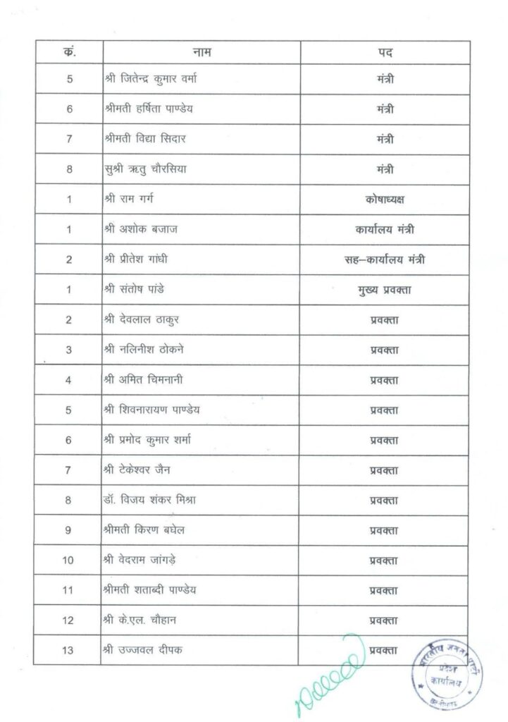 इसके अलावा, देवलाल ठाकुर, नितिन ठोकने, अमित चिमनानी समेत कुल 12 प्रवक्ताओं की नियुक्ति की गई है, जो पार्टी की नीतियों और कार्यक्रमों को जनता तक पहुंचाने का काम करेंगे।