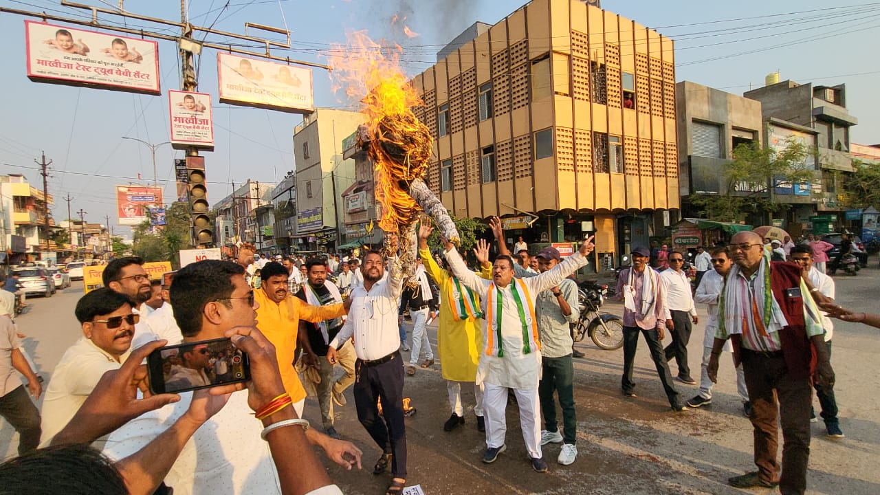 मुंगेली: प्रदेश कांग्रेस कमेटी के अध्यक्ष दीपक बैज के निर्देशानुसार पूरे प्रदेश में सीबीआई छापेमारी के खिलाफ विरोध प्रदर्शन किया गया। इसी क्रम में जिला कांग्रेस कमेटी, मुंगेली ने अध्यक्ष घनश्याम वर्मा के नेतृत्व में पड़ाव चौक पर पुतला दहन कर विरोध जताया। बड़ी संख्या में कांग्रेस संगठन के पदाधिकारी एवं कार्यकर्ता इस प्रदर्शन में शामिल हुए।