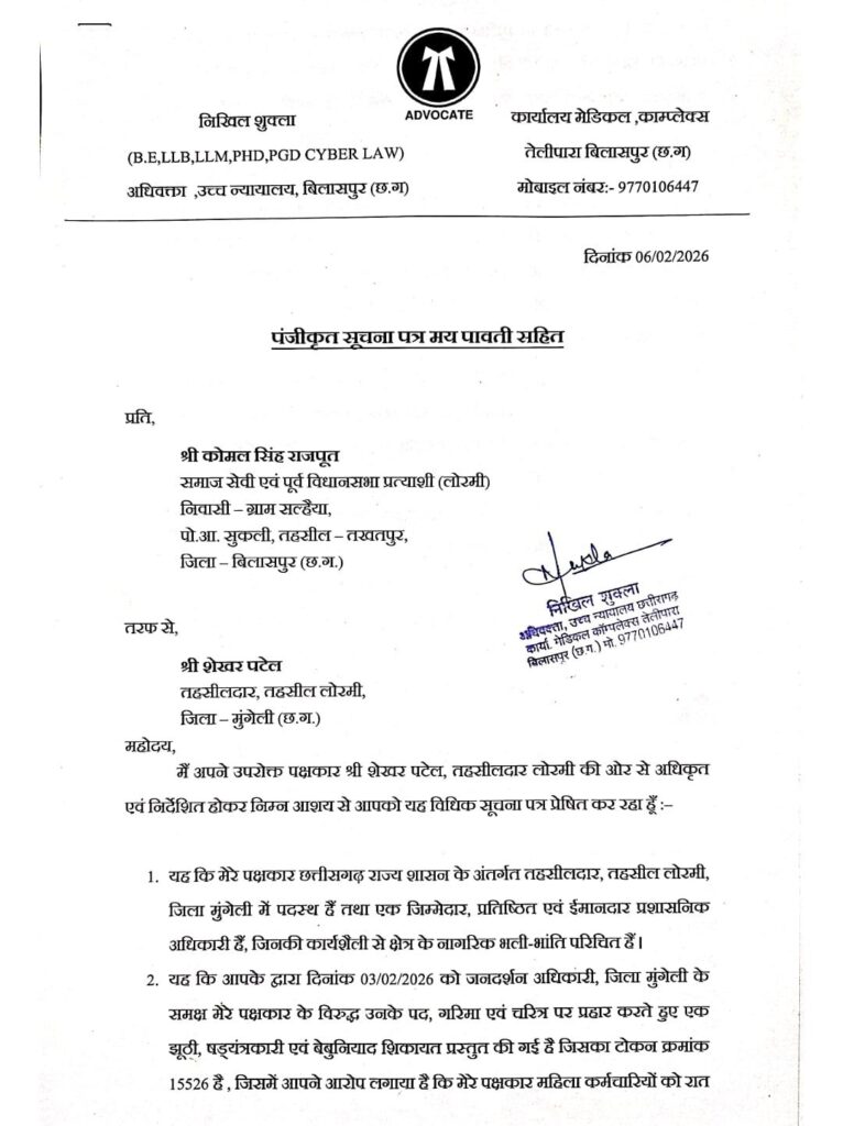 पिछले वर्षों से निष्पक्ष, पारदर्शी और संवेदनशील कार्यशैली के लिए पहचाने जाने वाले तहसीलदार शेखर पटेल ने अपनी प्रतिष्ठा को नुकसान पहुंचाने वाले आरोपों के खिलाफ कानूनी कदम उठाया है। अधिवक्ता निखिल शुक्ला के माध्यम से हाईकोर्ट में मानहानि संबंधी विधिक नोटिस भेजा गया है।