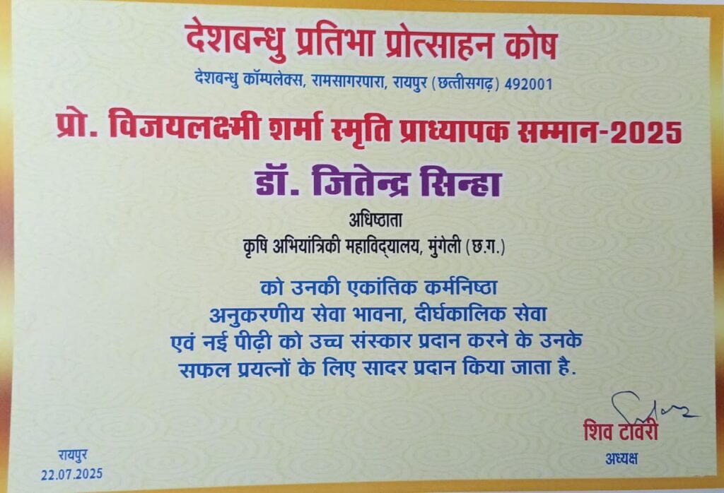 देशबंधु प्रतिभा प्रोत्साहन कोष द्वारा कृषि अभियांत्रिकी महाविद्यालय, मुंगेली के अधिष्ठाता डॉ. जितेन्द्र सिन्हा को “प्रो. विजयलक्ष्मी शर्मा स्मृति प्राध्यापक सम्मान-2025” से किया गया सम्मानित