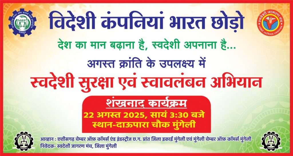 विदेशी कंपनियां भारत छोड़ो: मुंगेली में होगा ‘स्वदेशी सुरक्षा एवं स्वावलंबन अभियान’ का शंखनाद