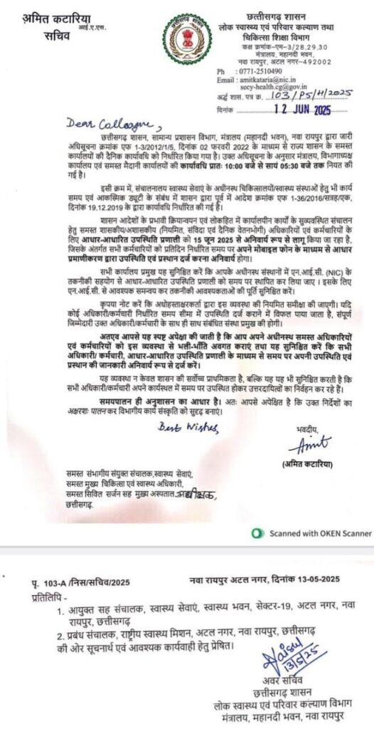 छत्तीसगढ़ सरकार के स्वास्थ्य विभाग में अब कर्मचारियों की उपस्थिति को लेकर कड़ाई बरती जाएगी। चिकित्सा सचिव अमित कटारिया ने सभी संभागीय संयुक्त संचालक, मुख्य चिकित्सा एवं स्वास्थ्य अधिकारी (CMHO) तथा सिविल सर्जनों को पत्र जारी कर निर्देश दिया है कि 15 जून 2025 से आधार आधारित उपस्थिति प्रणाली अनिवार्य रूप से लागू की जाए।
