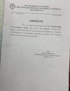 मुंगेली। तहसील लोरमी के बिठलदह निवासी स्व. गोरेलाल राजपूत ने जीवनकाल में मृत्यु के बाद शरीर दान करने का संकल्प लिया था, जिसे उनके परिवार ने पूरी निष्ठा से पूरा किया। मंगलवार को उनके देहांत के बाद, बेटी भगवती राठौर और दामाद रघुनाथ राठौर ने उनकी अंतिम इच्छा का सम्मान करते हुए मृत देह को छत्तीसगढ़ आयुर्विज्ञान संस्थान (सिम्स) मेडिकल कॉलेज बिलासपुर को शोध कार्य के लिए दान किया।
