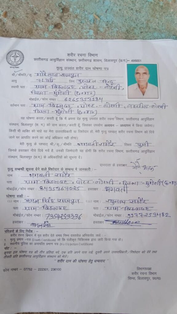 गौरतलब है कि 13 नवंबर 2024 को प्रयास अ स्माल स्टेप फाउंडेशन द्वारा आयोजित जिला स्तरीय अंगदान-शरीरदान प्रेरणा शिविर में 151 लोगों ने सामूहिक रूप से शपथ पत्र भरकर दान की घोषणा की थी। इसी शिविर में स्व. गोरेलाल राजपूत ने अपने पूरे शरीर को दान करने का संकल्प लिया था।