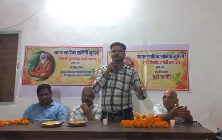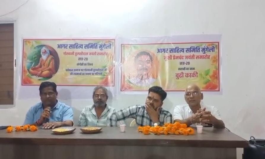 मुंगेली // प्रतिवर्ष की तरह इस वर्ष भी आगर साहित्य समिति मुंगेली द्वारा गोस्वामी तुलसीदास एवं मुंशी प्रेमचंद जयंती का आयोजन उत्साहपूर्वक किया गया। कार्यक्रम की शुरुआत मां सरस्वती के छायाचित्र में दीप प्रज्वलन के साथ हुई। इसके पश्चात सुश्री अभिलाषा पांडे ने मां वीणापाणी की वंदना प्रस्तुत की।