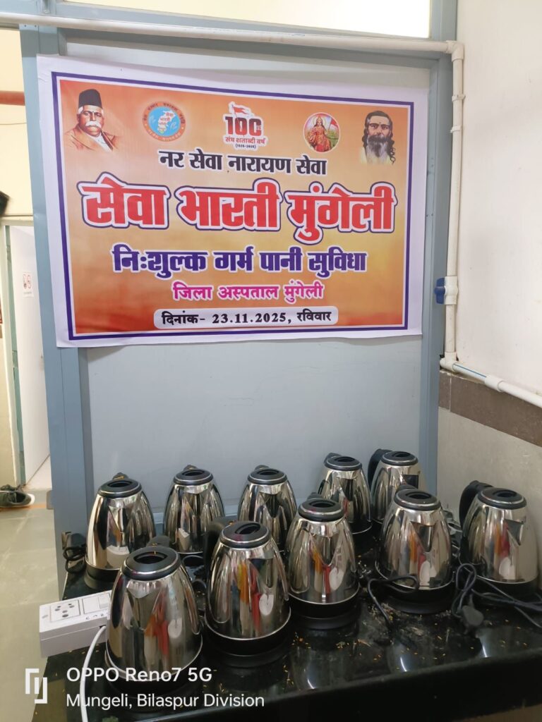 मुंगेली। सेवा भारती मुंगेली द्वारा जिला अस्पताल में मरीजों और उनके परिजनों के लिए नि:शुल्क गर्म पानी सुविधा की शुरुआत की गई। ठंड के मौसम को ध्यान में रखते हुए अस्पताल परिसर में 10 केतली लगाकर इस सेवा कार्य का आरंभ किया गया।