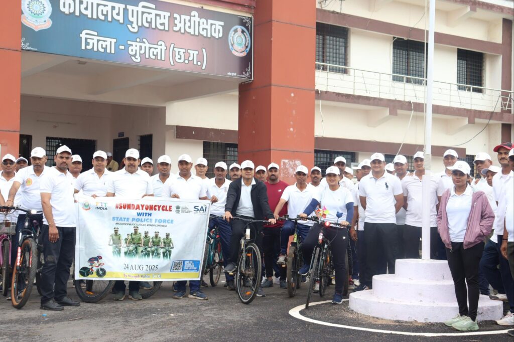 मुंगेली। फिट इंडिया मिशन और खेलो इंडिया योजना के तहत पूरे देश में 24 अगस्त 2025 को “Sunday of on Cycle” अभियान का आयोजन किया गया। इसी क्रम में मुंगेली पुलिस अधीक्षक भोजराम पटेल के नेतृत्व में जिले में साइकिलिंग रैली निकाली गई। इस अवसर पर पुलिस विभाग के अधिकारी और कर्मचारी बड़ी संख्या में शामिल हुए और आम नागरिकों को स्वस्थ व फिट रहने का संदेश दिया।