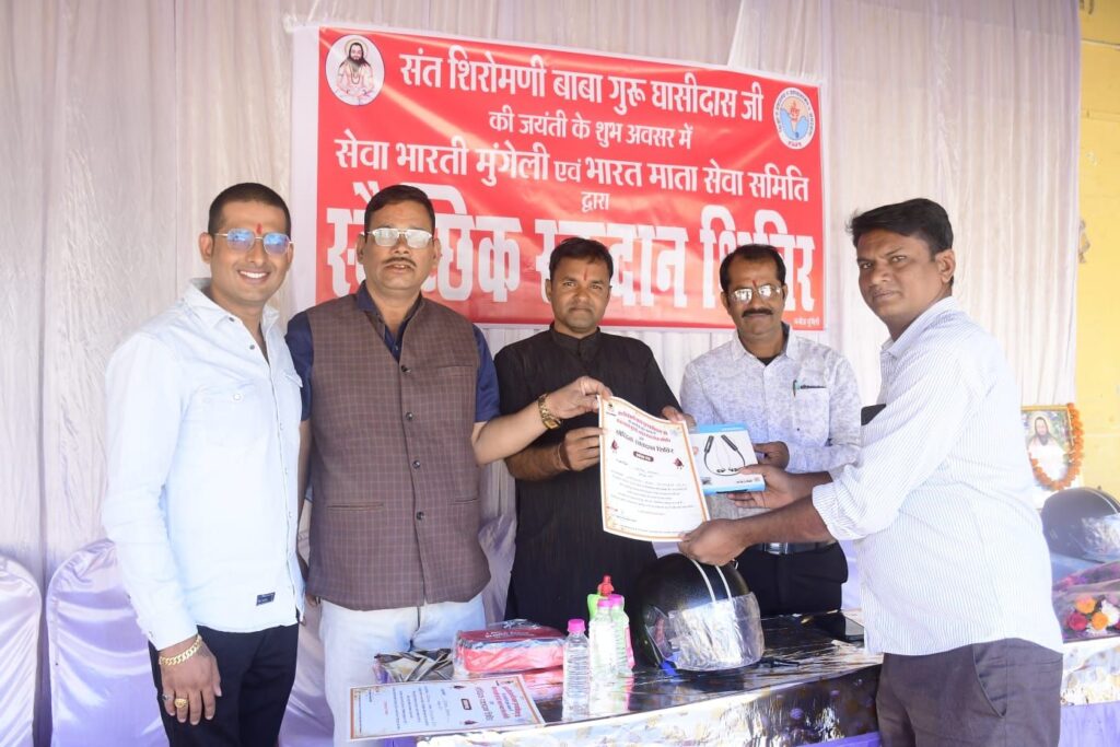 मुंगेली: सेवा भारती मुंगेली और भारत माता सेवा समिति द्वारा संत शिरोमणि बाबा गुरु घासीदास के प्रकाश पर्व के अवसर पर 15 दिसंबर, रविवार को नगर पालिका विद्यालय प्रांगण में नि:शुल्क रक्तदान शिविर का आयोजन किया गया। इस शिविर में विभिन्न वर्गों के 87 लोगों ने 87 यूनिट रक्तदान किया। रक्तदान करने वाले सभी लोगों को प्रमाण पत्र के साथ 40 लोगों को हेलमेट, 20 लोगों को ईयरफोन और 20 लोगों को लंच बॉक्स देकर सम्मानित किया गया।
