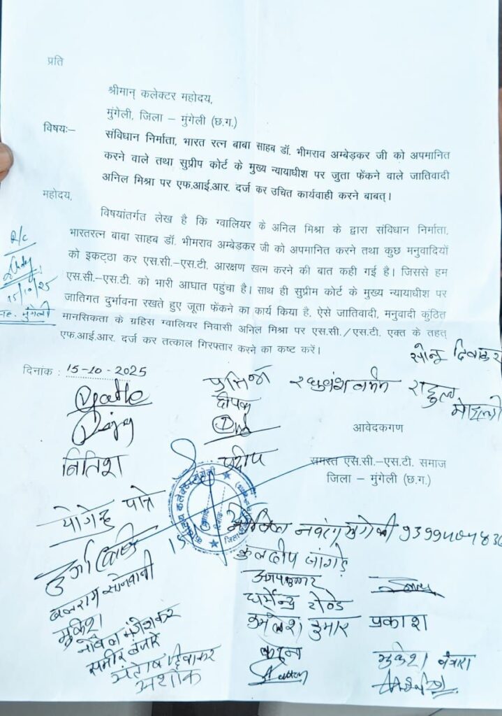 इस घटना से आक्रोशित युवाओं ने सोमवार को जिला कलेक्टर मुंगेली को ज्ञापन सौंपा। ज्ञापन में आरोपी के खिलाफ एससी/एसटी (अत्याचार निवारण) अधिनियम के तहत एफआईआर दर्ज कर तत्काल गिरफ्तारी और निष्पक्ष जांच की मांग की गई।