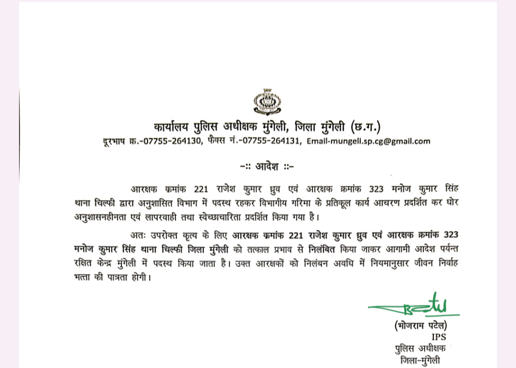 मुंगेली। थाना चिल्फी में पदस्थ दो आरक्षक मनोज कुमार सिंह और राजेश ध्रुव का वर्दी में आपत्तिजनक वीडियो सोशल मीडिया पर वायरल होने के बाद पुलिस विभाग में हड़कंप मच गया। मामले को गंभीरता से लेते हुए मुंगेली पुलिस अधीक्षक भोजराम पटेल (भा.पु.से.) ने दोनों आरक्षकों को तत्काल प्रभाव से निलंबित कर रक्षित केंद्र मुंगेली में पदस्थ किया है। साथ ही विभागीय जांच के आदेश भी जारी किए गए हैं।