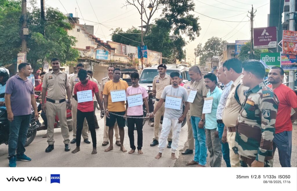 मुंगेली। पुलिस अधीक्षक भोजराम पटेल (भा.पु.से.) के निर्देशन में जिले में नशे के कारोबार के खिलाफ कड़ी कार्रवाई की गई। ‘‘ऑपरेशन बाज’’ के तहत पुलिस ने ब्राउन शुगर, गांजा व अन्य नशे का कारोबार करने वाले 8 तस्करों को गिरफ्तार कर शहरभर में जुलूस निकाला। इस दौरान आरोपियों से नारा लगवाया गया – “हम हैं नशा के सौदागर, हमसे बचिए और अपने बच्चों को भी बचाइए।”