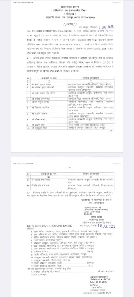 माननीय विशेष न्यायालय, भ्रष्टाचार निवारण अधिनियम रायपुर में 7 जुलाई 2025 को अभियोग पत्र पेश किए जाने के बाद शासन ने छत्तीसगढ़ सिविल सेवा नियम 1966 के नियम 9(1)(ख) के अंतर्गत यह निलंबन आदेश जारी किया है।