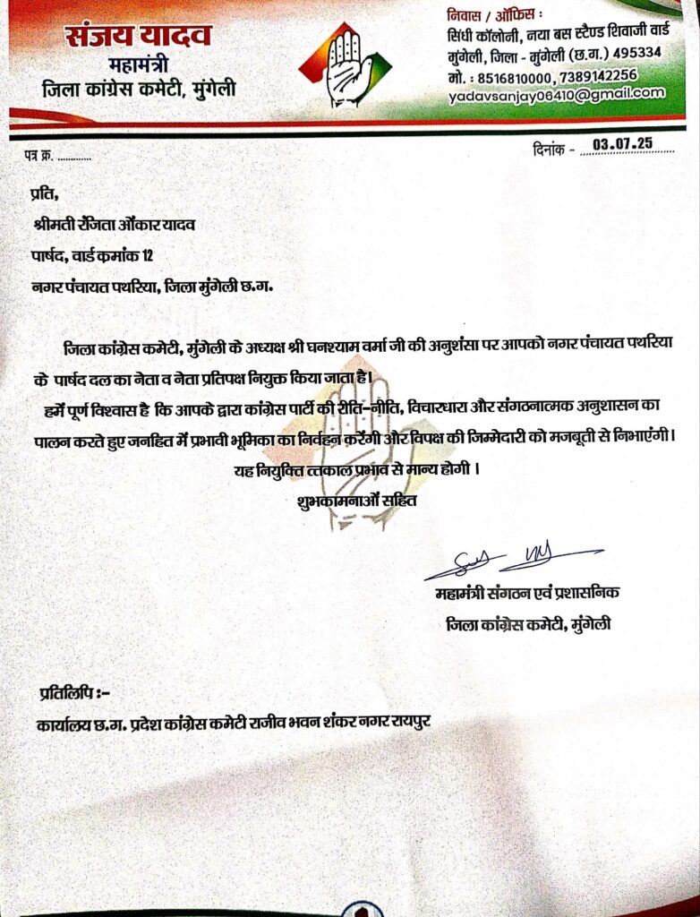 मुंगेली, 3 जुलाई 2025 — नगर पंचायत पथरिया के वार्ड क्रमांक 12 की पार्षद श्रीमती रंजिता ओंकार यादव को कांग्रेस पार्षद दल का नेता प्रतिपक्ष नियुक्त किया गया है। यह आदेश जिला कांग्रेस कमेटी मुंगेली द्वारा जारी किया गया है।