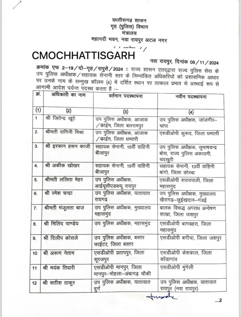 रायपुर: छत्तीसगढ़ पुलिस विभाग में एक बार फिर बड़ा प्रशासनिक फेरबदल किया गया है। राज्य सरकार ने शुक्रवार को राज्य पुलिस सेवा के 25 अधिकारियों का तबादला आदेश जारी किया है।