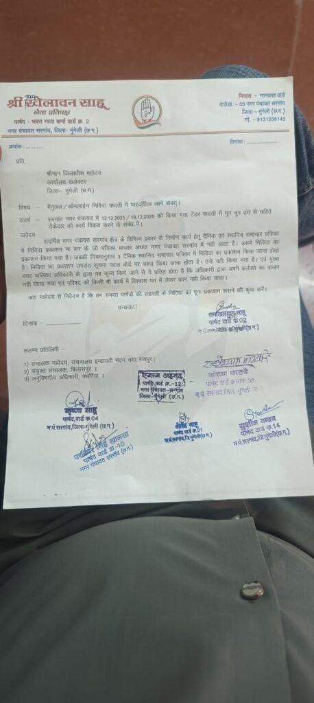 नगर पंचायत सरगांव में विकास कार्यों के लिए जारी की गई टेंडर प्रक्रिया को लेकर बड़ा विवाद सामने आया है। नगर पंचायत के कई पार्षदों ने संयुक्त रूप से कलेक्टर मुंगेली को ज्ञापन देकर ई-टेंडर प्रक्रिया में गंभीर अनियमितताओं और नियमों के उल्लंघन का आरोप लगाया है। पार्षदों का कहना है कि नगर में विभिन्न निर्माण कार्यों के लिए 12 दिसंबर 2025 से 19 दिसंबर 2025 के बीच टेंडर आमंत्रित किए गए, लेकिन पूरी प्रक्रिया पारदर्शिता के मानकों पर खरी नहीं उतरती।