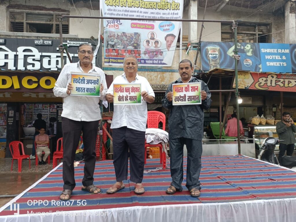 कार्यक्रम में विशेष रूप से नरेंद्र कोटड़िया, प्रवीण वैष्णव, प्रेम आर्य, कोमल शर्मा, आकाश सोनी, रितेश वाधवा, राम तलरेजा, सावन सोनी, रोशन सोनी, निमेष देवांगन और मनीष वाधवा शामिल हुए। सभी ने मिलकर स्वदेशी अपनाने और विदेशी वस्तुओं के बहिष्कार का संकल्प लिया।