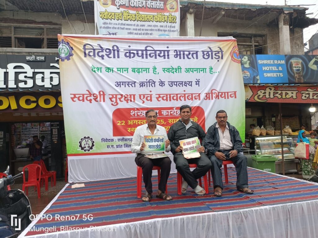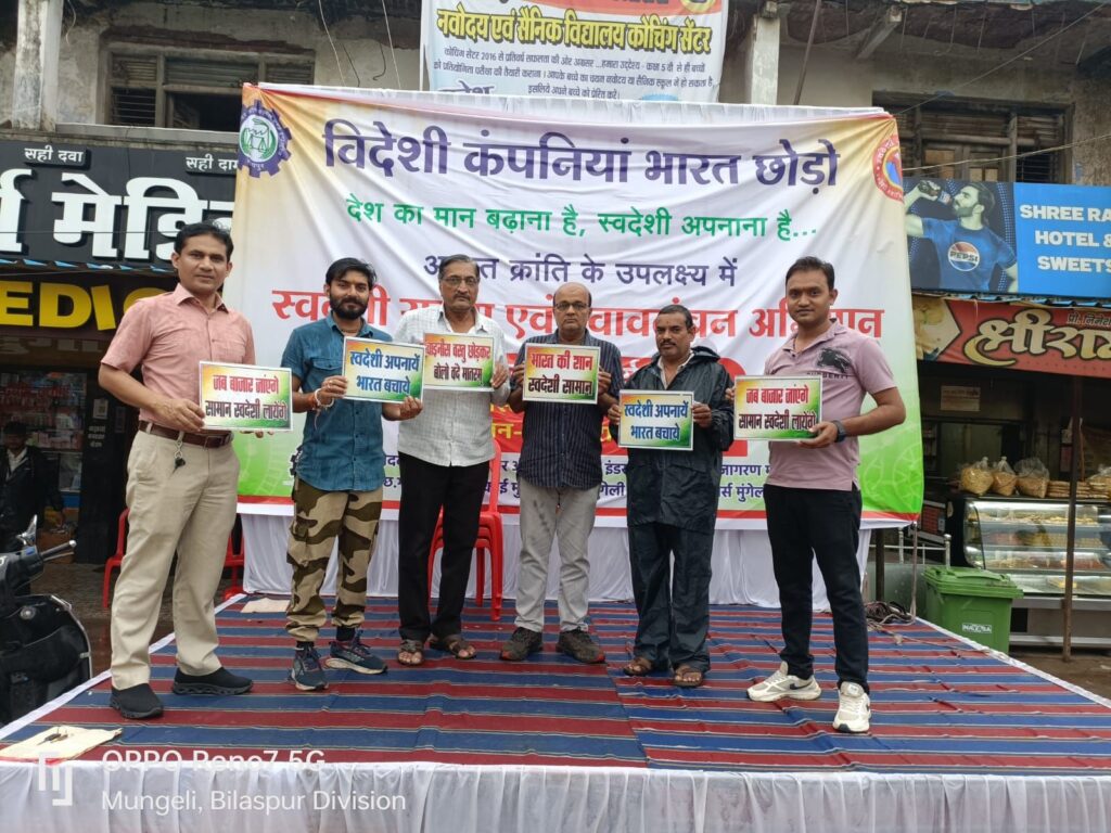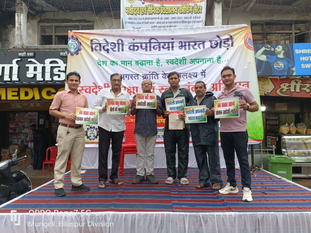 मुंगेली। अगस्त क्रांति के अवसर पर स्वदेशी जागरण मंच द्वारा आयोजित स्वदेशी सुरक्षा एवं स्वावलंबन अभियान का शंखनाद कार्यक्रम आज मुंगेली के दाऊपारा चौक में संपन्न हुआ। इस अवसर पर बड़ी संख्या में व्यापारी, सामाजिक कार्यकर्ता और नागरिक उपस्थित रहे।