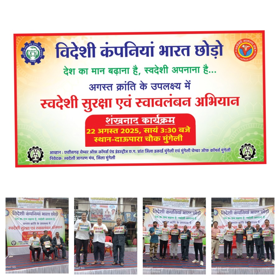मुंगेली। अगस्त क्रांति के अवसर पर स्वदेशी जागरण मंच द्वारा आयोजित स्वदेशी सुरक्षा एवं स्वावलंबन अभियान का शंखनाद कार्यक्रम आज मुंगेली के दाऊपारा चौक में संपन्न हुआ। इस अवसर पर बड़ी संख्या में व्यापारी, सामाजिक कार्यकर्ता और नागरिक उपस्थित रहे।