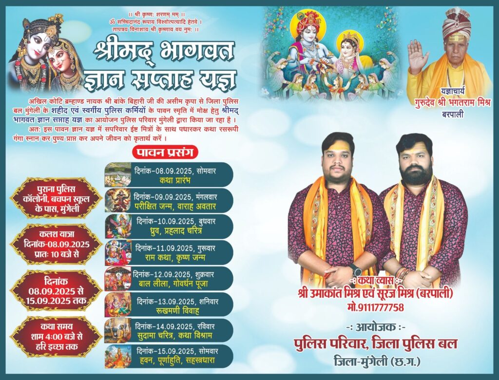 मुंगेली पुलिस कॉलोनी में आज से शुरू होगा श्रीमद्भागवत ज्ञान सप्ताह यज्ञ : शहीदों की स्मृति में आध्यात्मिक पहल, पुलिस अधीक्षक भोजराम पटेल का अभिनव प्रया