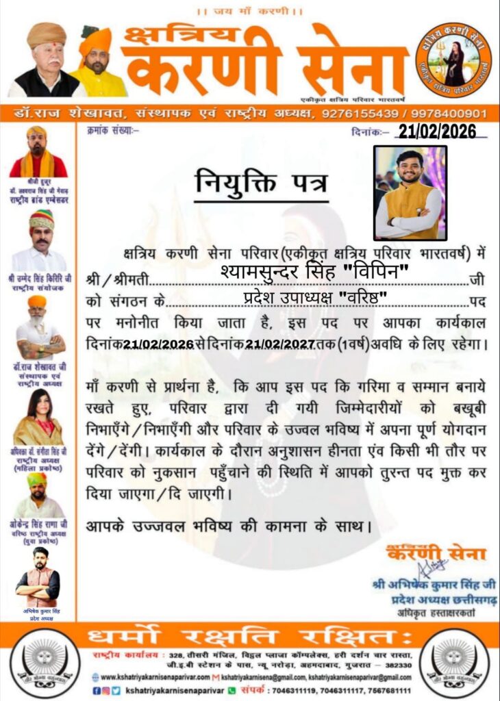मुंगेली/छत्तीसगढ़। क्षत्रिय करणी सेना परिवार (एकीकृत क्षत्रिय परिवार भारतवर्ष) ने संगठन विस्तार के तहत श्यामसुंदर सिंह “विपिन” को महत्वपूर्ण जिम्मेदारी सौंपते हुए प्रदेश उपाध्यक्ष (वरिष्ठ) पद पर मनोनीत किया है। इस संबंध में संगठन द्वारा विधिवत नियुक्ति पत्र जारी किया गया है।