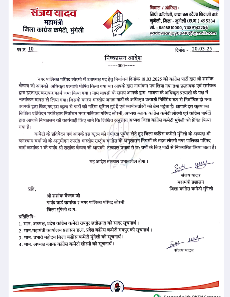 लोरमी: छत्तीसगढ़ प्रदेश कांग्रेस कमेटी के सह प्रभारी विजय जांगिड़ ने स्पष्ट रूप से कहा कि पार्टी में अनुशासनहीनता एवं गद्दारी को किसी भी सूरत में बर्दाश्त नहीं किया जाएगा। इसी कड़ी में, नगर पालिका परिषद उपाध्यक्ष चुनाव में कांग्रेस के अधिकृत प्रत्याशी शशांक वैष्णव को पार्टी से निष्कासित करने का निर्देश दिया गया है।