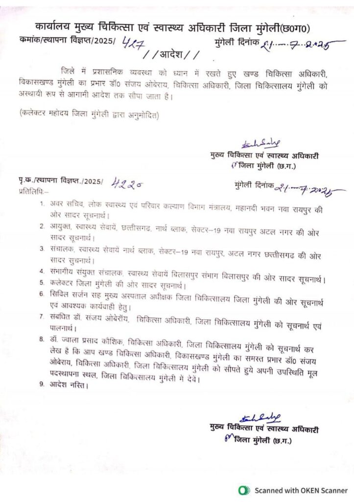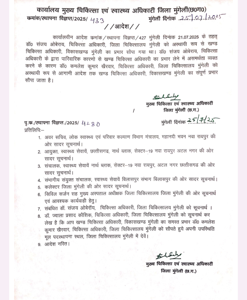 यह आदेश 25 जुलाई को सीएमएचओ मुंगेली द्वारा जारी किया गया और संबंधित सभी उच्च अधिकारियों और कार्यालयों को सूचित कर दिया गया है।