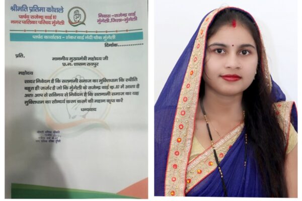 राजेन्द्र वार्ड क्रमांक 07 की पार्षद श्रीमती प्रतिभा कोशले ने सतनामी समाज के हित में एक महत्वपूर्ण पहल करते हुए मुख्यमंत्री छत्तीसगढ़ शासन को पत्र लिखा है। इस पत्र में उन्होंने मुंगेली के राजेन्द्र वार्ड स्थित सतनामी समाज के मुक्तिधाम की जर्जर स्थिति की ओर ध्यान आकर्षित कराया है। पत्र में पार्षद ने स्पष्ट किया…
