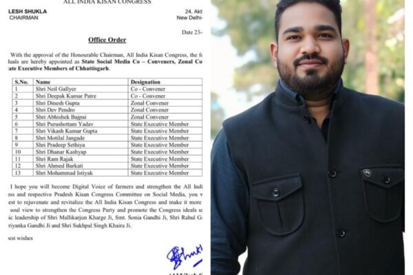 किसान हितों की बुलंद आवाज को संगठन में मिला बड़ा दायित्व रायपुर। छत्तीसगढ़ प्रदेश की सक्रिय युवा नेतृत्व क्षमता को पहचानते हुए कांग्रेस पार्टी ने एक और अहम निर्णय लिया है। सोशल मीडिया पर किसानों के मुद्दों को मुखरता से उठाने वाले मुंगेली के दीपक कुमार पात्रे को छत्तीसगढ़ प्रदेश किसान कांग्रेस का सहसंयोजक नियुक्त…