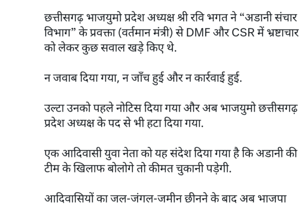 छत्तीसगढ़ के पूर्व मुख्यमंत्री भूपेश बघेल ने भारतीय जनता पार्टी की नई कार्यकारिणी को लेकर ट्वीट किया है। उन्होंने दावा किया कि भाजयुमो प्रदेश अध्यक्ष पद से रवि भगत को हटाए जाने के पीछे उनकी “अडानी टीम” के खिलाफ की गई टिप्पणी जिम्मेदार है। बघेल ने लिखा कि रवि भगत ने वर्तमान मंत्री से DMF…