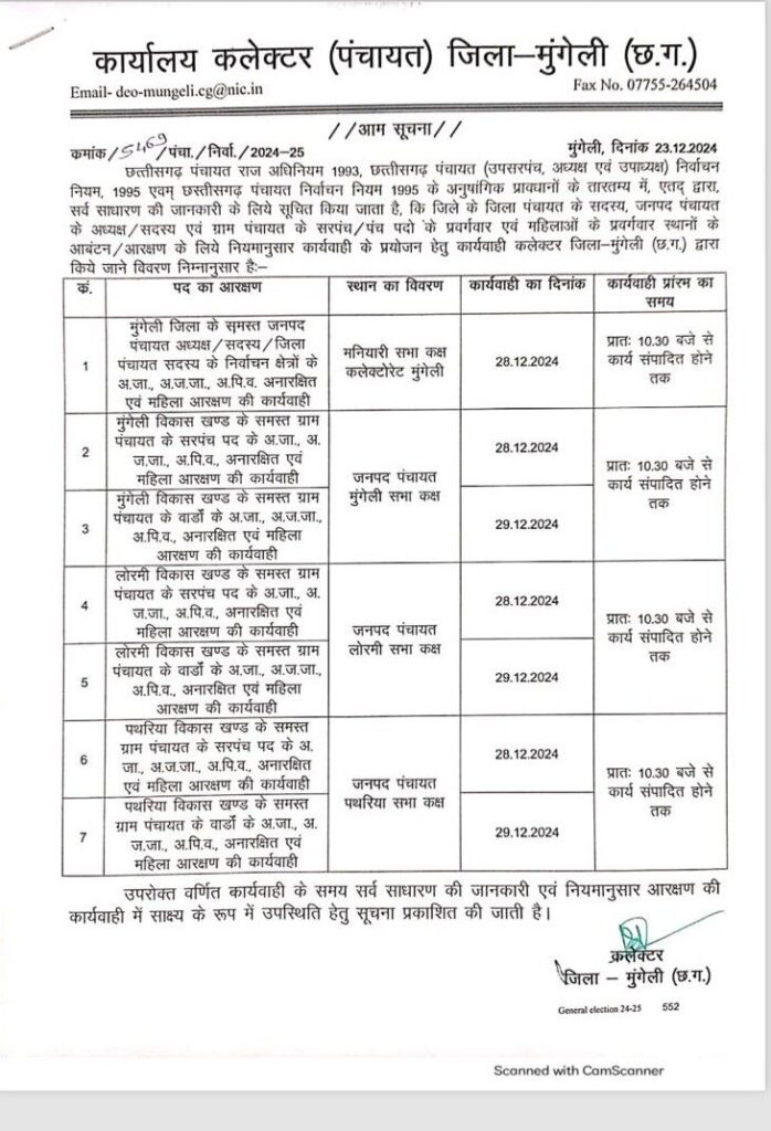 मूंगेली, छत्तीसगढ़: जिला पंचायत मूंगेली में छत्तीसगढ़ पंचायत राज अधिनियम 1993 और पंचायत निर्वाचन नियम 1995 के तहत त्रिस्तरीय पंचायत चुनावों के लिए आरक्षण प्रक्रिया शुरू होने जा रही है। यह प्रक्रिया कलेक्टर (पंचायत) कार्यालय मूंगेली द्वारा जारी अधिसूचना के अनुसार, 28 दिसंबर 2024 से अलग-अलग स्थानों और तिथियों पर आयोजित की जाएगी।