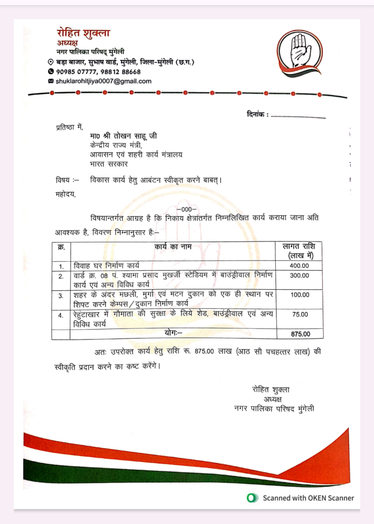 रोहित शुक्ला ने बताया कि नगर के नागरिकों की लंबे समय से चली आ रही मांगों को पूरा करने के उद्देश्य से उन्होंने केंद्रीय मंत्री के समक्ष 875 लाख रुपये के विकास कार्यों का प्रस्ताव रखा है।