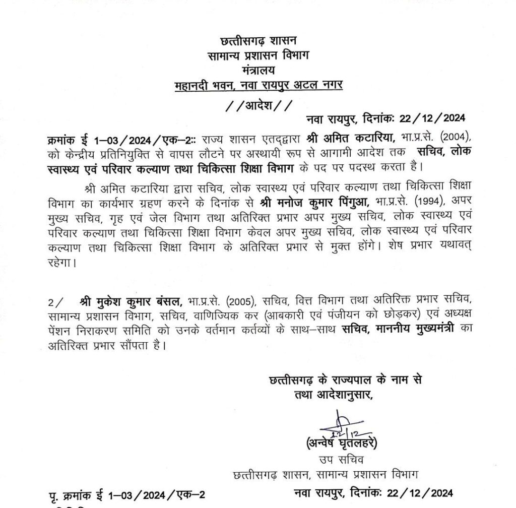 केंद्रीय प्रतिनियुक्ति से वापस आए आईएएस अमित कटारिया को अस्थाई रूप से सचिव, लोक स्वास्थ्य एवं परिवार कल्याण और चिकित्सा शिक्षा विभाग का दायित्व सौंपा गया है। यह नियुक्ति अगले आदेश तक प्रभावी रहेगी।