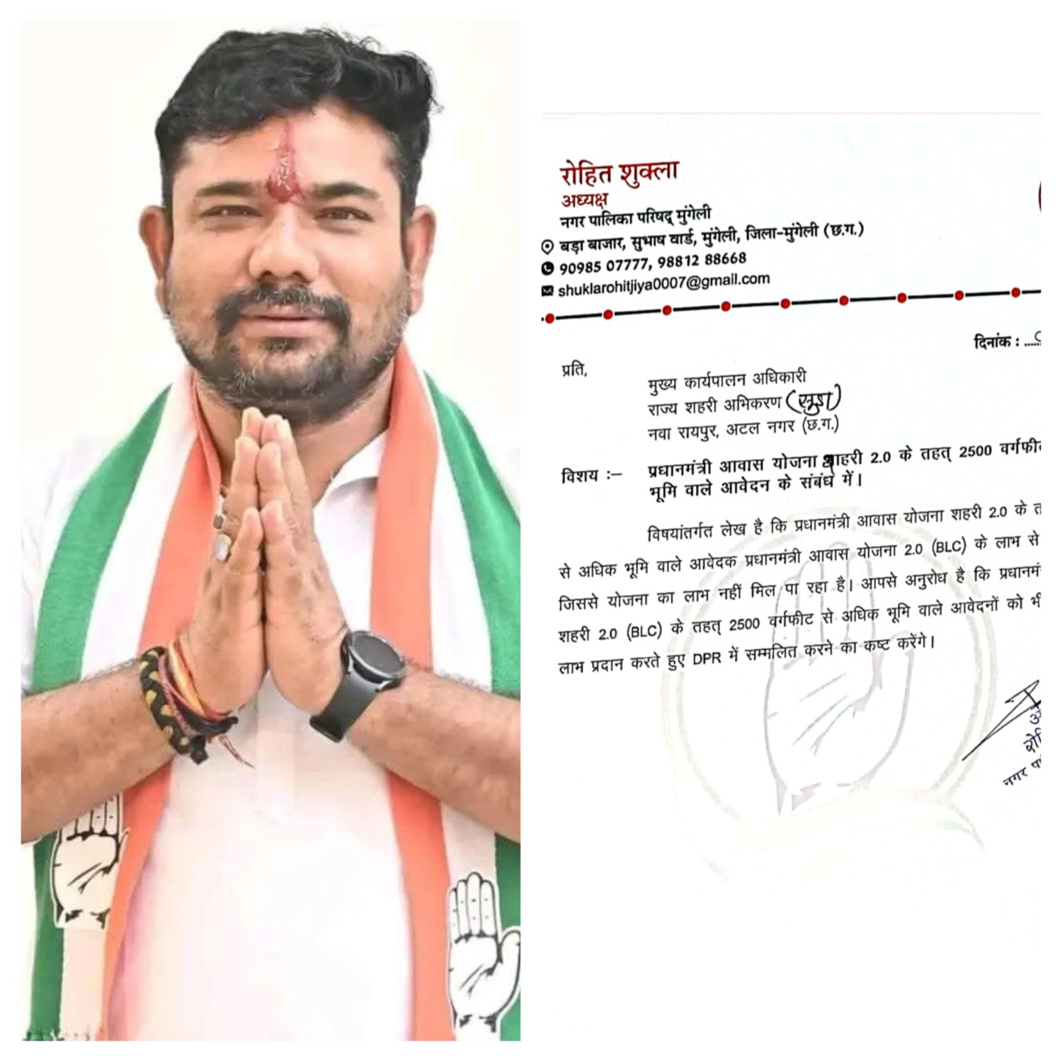 📍 मुंगेली, 1 अगस्त 2025/प्रधानमंत्री आवास योजना (शहरी) 2.0 के अंतर्गत 2500 वर्गफीट से अधिक भूमि रखने वाले हितग्राहियों को भी योजना का लाभ मिले – इस मांग को लेकर नगर पालिका परिषद मुंगेली के अध्यक्ष श्री रोहित शुक्ला ने राज्य शहरी प्रशासन (SUDA) को पत्र भेजा है।